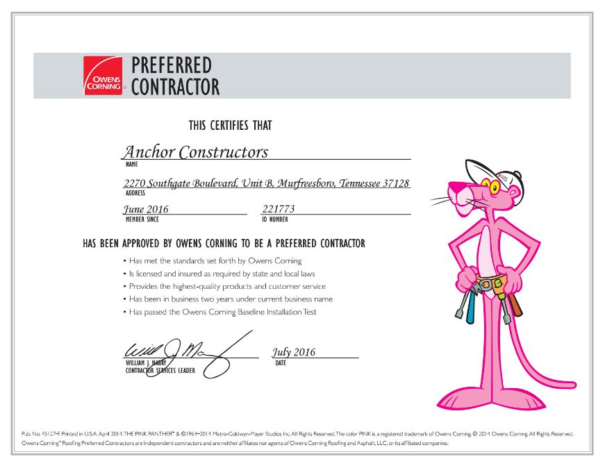 RoofingYour roof determines the overall look of your home while working hard to protect you and your family from the elements. When it is time to replace or repair your roof, make sure that you choose a contractor you can trust. Anchor Constructors is a certified installer for a wide range of roofing systems including architectural and three-tab shingles, metal panels and shingles, tiles, wood shakes, slate, standing seam, and roll roofing and use only the top of the line brands. Our wide variety of roofing options and material brands ensures that we can provide the most customer satisfaction possible.